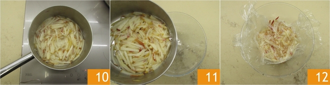 Then cut the slices into julienne strips 4. Transfer the pear sticks into a bowl 4 and add the sugar 5.