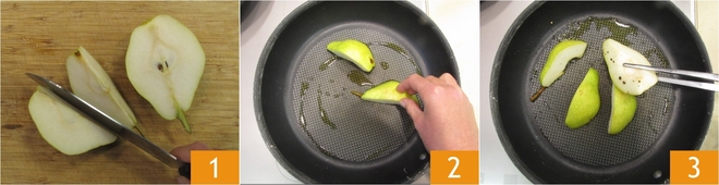 To make the pears and speck with dried fruit, first wash the pear and cut it into 4 wedges 1, then remove the core. Heat a drizzle of olive oil in a pan, add the pear wedges 2 and cook over medium-high heat on both sides for a few minutes 3. Season with salt and pepper.