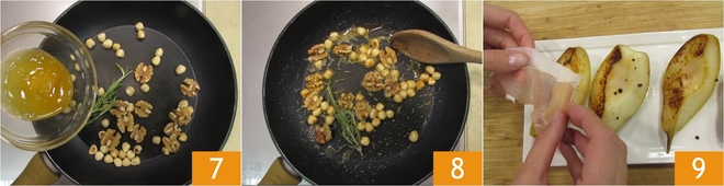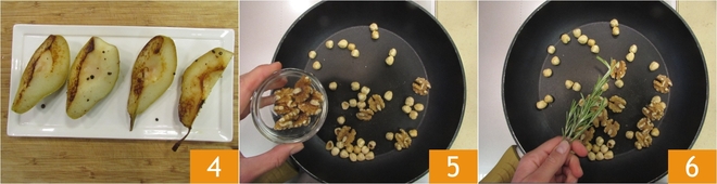 Once golden, turn off the heat and set the pears aside, keeping them warm 4. Put the mixed dried fruit and nuts in another pan 5 and add the rosemary 6.