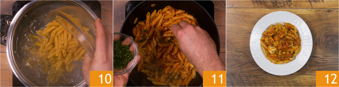 When the water reaches a boil, throw in the pasta 10 and cook it until al dente. Drain it and transfer it directly into the pan. Mix well, add the chopped parsley 11, and mix again. Serve the penne all'arrabbiata with champignon mushrooms while still very hot 12.