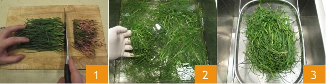 To prepare the perch fillet, start by preparing the Vegetable broth. Then proceed with cleaning the agretti: cut off the red-colored stem end 1, then rinse them under running water to wash them thoroughly and remove any traces of soil 2, then let them drain 3.