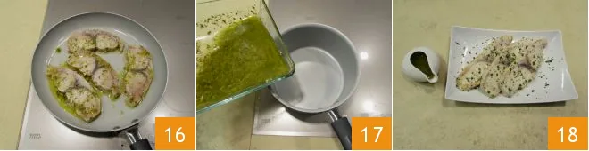 and cook the fillets for 4-5 minutes over low heat, turning them only once 16: they should be lightly golden on each side. Meanwhile, pour the marinade (salmoriglio) into a non-stick saucepan with high sides and cook it for about 5 minutes over low heat 17: this way you will reduce the marinade, making it thicker and richer. At this point, both the swordfish and the marinade will be ready: place the swordfish slices on a plate and serve your swordfish in salmoriglio with a jug containing the marinade 18!
