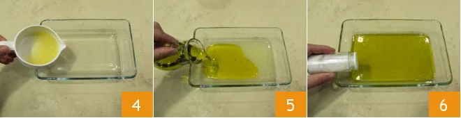 Now pour it into a large bowl for the marinade 4, adding the oil 5, and seasoning with salt 6 and pepper.