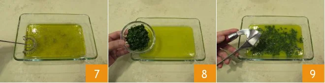 Also, add the oregano leaves 10 and whisk the mixture again vigorously with the flat whisk 10: you should obtain a homogeneous emulsion. At this point, cut the swordfish into slices about 1 cm (approximately 3/8 inch) thick 12: you should get about 4 slices, each weighing around 4.2 oz.