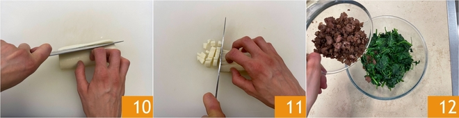 Cut the pasta filata cheese first into sticks 10 and then into cubes 11. In a bowl combine the spinach and the sausage 12.