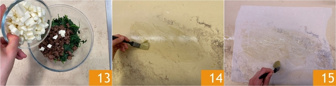 Complete the filling with the cheese cubes 13 and mix. Brush the work surface with oil 14, then lay a sheet of parchment paper so that it adheres well. Brush the parchment paper as well 15.