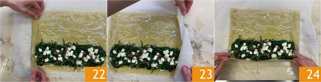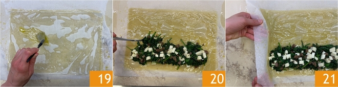 Continue this way with all 6 sheets of phyllo pastry. Brush the top layer with oil 19 and fill the lower half with the filling, taking care to leave a free border 20. Now close the pastry: lift the parchment paper to slightly fold the short side 21.