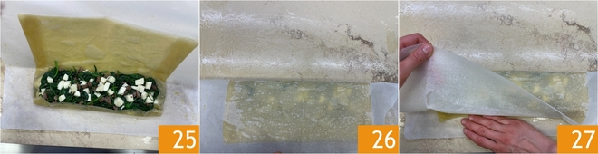 Fold the phyllo over on top 25 so as to form a roll wrapped in parchment paper 26. Now gently unroll the parchment paper 27.