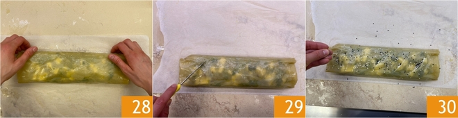 Seal the closing seam well with gentle pressure 28. Make 5 diagonal cuts on the surface 29 and garnish with white and black sesame seeds 30 and poppy seeds.