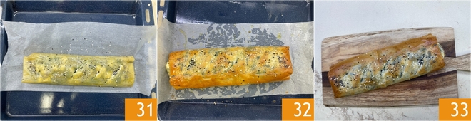 Transfer the strudel to a baking sheet, seam side down 31. Bake in a preheated conventional oven at 392°F for 20 minutes. Remove from the oven 32 and let cool slightly. The phyllo pastry strudel with sausage and spinach is ready to be enjoyed 33!
