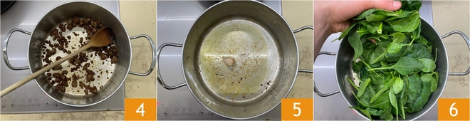 Brown the sausage until golden 4, then transfer it to a bowl. In the same pan heat another drizzle of oil with a clove of garlic 5, then add the spinach leaves 6.