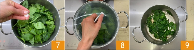 Season with salt 7, cover with a lid 8 and continue cooking for about 3 minutes over medium heat, or until the spinach is tender. At this point remove the lid and continue cooking for another minute to dry them out 9.