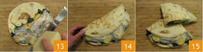 Transfer the piadina to a cutting board and add the grated Pecorino cheese 13, then fold it in half 14 and divide it into 2 equal parts: your piadina with greens, potatoes, and Colonnata lard is ready to be served 15!