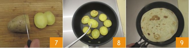 When the potatoes are also cooked, drain them and cut them into slices about 0.2 inches thick, without peeling them 7. Heat a non-stick pan and grill the potato slices on both sides for a total of about 10 minutes 8. Once all the ingredients are ready, heat the piadina for about 2 minutes in a pan, turning it on both sides 9.