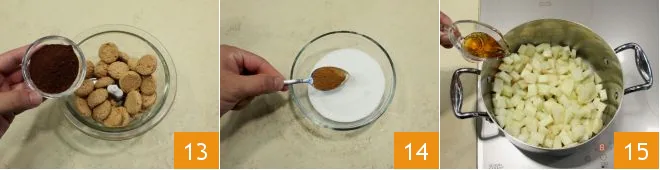 add the cinnamon-flavored sugar to the pears 16 and then the amaretti and cocoa powder 17, mix well with a spoon 18 and cook over moderate heat until the pears have lost their water, about 10 minutes;