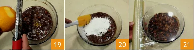 transfer the obtained mixture to a bowl and let it cool slightly, then add the orange zest 19 and the cornstarch 20, then cover with plastic wrap and set aside 21.