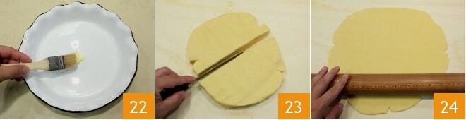 Grease a 8-inch diameter mold on the bottom (and 9 inches on top if using a fluted one) with a pat of butter 22; then take the pastry dough and divide it 23, taking two-thirds for the base and one-third for the top. Roll out the two-thirds of pastry into a disc 1/8 inch thick 34