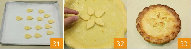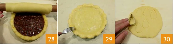 Cover with the other disc made with a third of the dough 28; always brush with orange marmalade and prick the edges with a fork 29, so that during cooking the moisture of the filling can escape without ruining the pie; knead and roll out the leftover pastry: you can create decorations 30