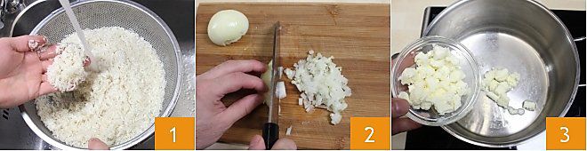 To prepare pilaf rice, start by thoroughly washing the rice under running water using a strainer 1 to remove the starch, then let it drain and dry.