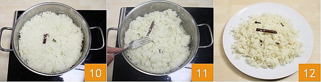 Once cooked and well-dried 10, remove the pilaf rice from the heat, fluff it well with a fork 11, turn it out onto a serving dish, and serve at the table 12. Here is your fragrant pilaf rice ready!