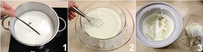 To prepare penguin ice cream, first, make the cream ice cream: pour the milk into a saucepan, add the sugar, cream, and opened vanilla pod 1, then mix and heat the mixture to no more than 185°F. Once the temperature is reached, immediately place the saucepan in a container with ice water to quickly lower the temperature of the mixture 2, and once cold, pour it into an ice cream maker and churn for at least 30 minutes until the mixture is thick and creamy 3. To see the cream ice cream guide Vanilla Ice Cream