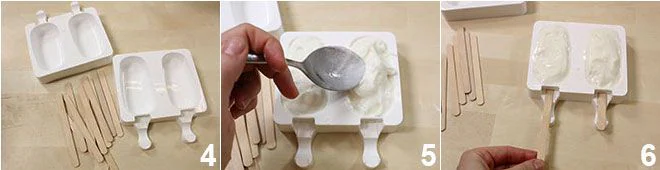 Now prepare everything you need to make your penguin: you will need to get silicone molds and ice cream sticks 4. Fill the molds with the ice cream 5, level it well, tap the mold a little to avoid forming bubbles, and finally insert the sticks 6. Let the ice creams firm up overnight in the freezer.