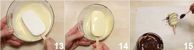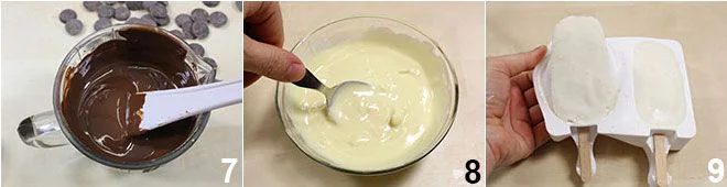 After this time, melt the dark and white chocolate in a bain-marie or microwave (7-8) and let it cool to room temperature. Take the ice creams out of the freezer and unmold them 9.