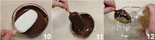 Dip 3 ice creams in the dark chocolate, being careful to seal the bottom well with the chocolate, leaving no open spaces or holes from which the ice cream might leak out (10-11). Let them cool in the freezer placed on a baking sheet for at least an hour. If you want to decorate them with chopped hazelnuts, sprinkle them on the chocolate as soon as you dip them, otherwise, the chocolate hardens immediately 12.