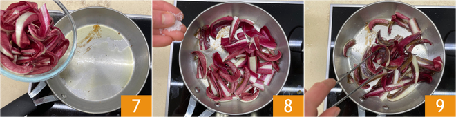 Still in the same pan, heat a drizzle of olive oil and add the radicchio 7. Season with salt 8 and sauté the radicchio for about one minute 9; it should remain crisp.