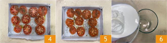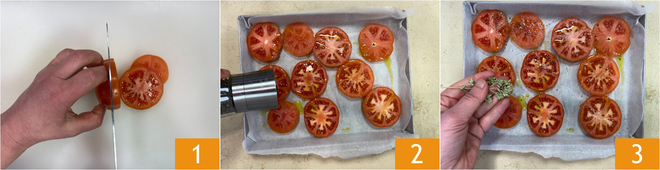 To prepare the pinsa with roasted tomatoes, burrata and cooked ham, start with the tomatoes. After washing and drying them, slice them into rounds about 3/8 inch (1 cm) thick 1. Place them on a baking sheet lined with parchment paper and season with oil, salt, pepper 2 and then oregano 3.