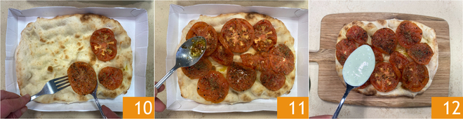 Place the pinsa base on a baking sheet lined with parchment, top it with the roasted tomatoes 10 and the juices they released 11. Bake for 5 minutes at 4286F, then remove from the oven and transfer to a cutting board. Then spread the burrata sauce 12.