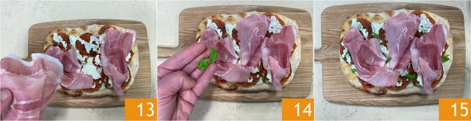 Garnish with slices of cooked ham 13 and basil leaves 14 and your pinsa with roasted tomatoes, burrata and cooked ham is ready 15.