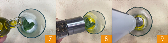 Add basil leaves, oil 7, salt and pepper 8 and blend everything; set aside 9.