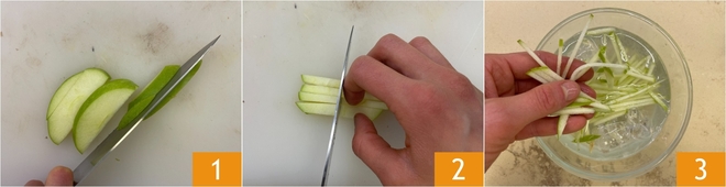 To prepare the pinsa with salmon, start with the green apple: wash it well, then—without removing the skin—cut it into wedges and then into sticks 1, from which you'll make matchsticks about 1 3/16 inches long and about 3/16 inch thick 2. Immerse the apples in water with ice and lemon juice until ready to use, so they won't turn brown 3.