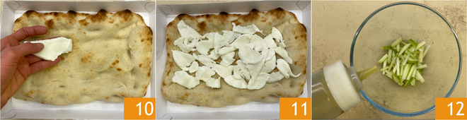 Now place the mozzarella slices on the pinsa base 10 and bake it for 5 minutes in a preheated convection oven at 482°F, placing it on the lower rack 11. Meanwhile, drain the apples and dress them with a drizzle of olive oil 12.