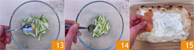 Also season with salt and mustard 13, then mix well 14. Remove the pinsa from the oven and lay the slices of smoked salmon on top 15.
