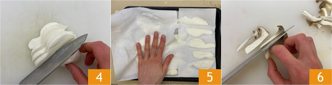 Cut the mozzarella into slices about 1/8 inch thick 4, transfer them to a tray and pat them dry with kitchen paper 5. Set aside and slice the cardoncelli mushrooms 6.