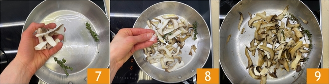 In a pan heat a drizzle of olive oil with some sprigs of lemon thyme, then add the cardoncelli 7 and season with salt 8. Sauté the mushrooms over medium heat for 5–6 minutes 9.