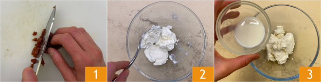 To prepare the pinsa with zucchini flowers, anchovies and cheese cream, first chop the sun-dried tomatoes 1. In a bowl, mix the spreadable cheese with the ricotta 2, then add the milk 3.