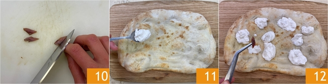 Finally, cut the anchovies in oil into diamond-shaped pieces 10. Remove the pinsa base from the oven and top with small dollops of the cheese cream 11, then add the pieces of anchovy 12.