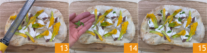 Place the zucchini flowers on the surface and scent with grated lemon zest 13 and a few leaves of fresh oregano 14. Your pinsa with zucchini flowers, anchovies and cheese cream is ready to be served 15!