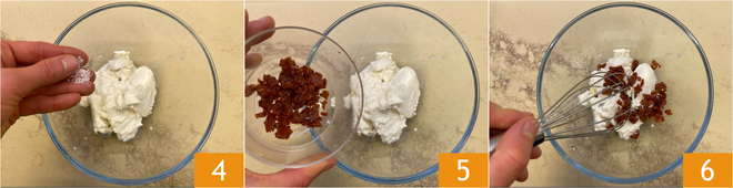 Season with salt 4 and add the chopped sun-dried tomatoes 5. Blend the mixture with a whisk 6.