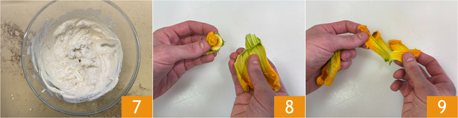 You should obtain a smooth, homogeneous cream 7. Bake the pinsa base in a preheated convection oven at 482°F for 5 minutes. Meanwhile, remove the pistil from the zucchini flowers 8 and cut them into thin strips 9.