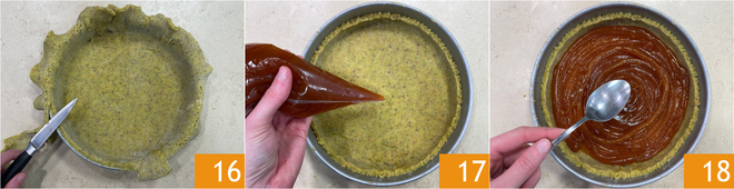 Butter the pan and line it with the pastry, then trim the edges 16. Fill the tart with apricot jam 17 and level it with the back of a spoon 18.