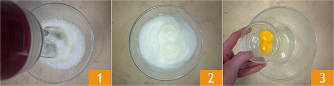 Add the sugar 4 and beat with an electric mixer 5 until you get a smooth mixture 6.
