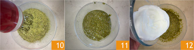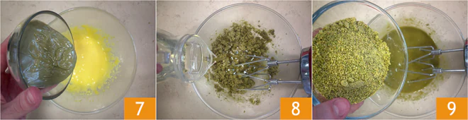 Add the pistachio paste 7 and mix again to combine. At this point, add the vegetable oil 8 and the pistachio flour 9.