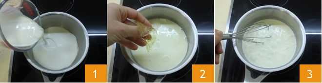 To prepare the pistachio cream, start by soaking the gelatin sheet in cold water for 5-10 minutes. While the gelatin softens, pour the fresh cream into a saucepan 1 and let it come close to a boil, then turn off the heat, drain the gelatin, squeeze it, and add it to the hot cream 2. Stir with a whisk to dissolve the gelatin better 3