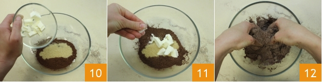 and the cold butter cut into small pieces 10. Finish with a pinch of salt 11 and crumble everything with your hands 12, creating coarse crumbs.
