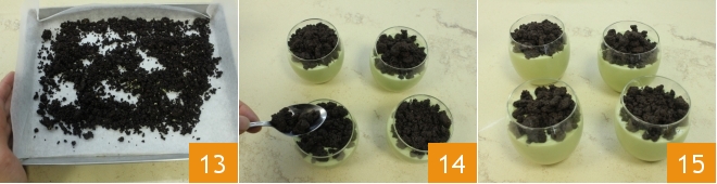 Then line a baking sheet with parchment paper and place the cocoa crumble on it 13. Bake in a preheated static oven at 350°F for 20 minutes, until the crumbs are crunchy (if using a convection oven, bake at 320°F for about 10-15 minutes). Once the baking time is over, let the crumbs cool. After the 3 hours of setting time for the cream in the refrigerator, garnish each glass by forming a layer of cocoa crumble 14. All that's left is to serve your pistachio cream with cocoa crumble 15!