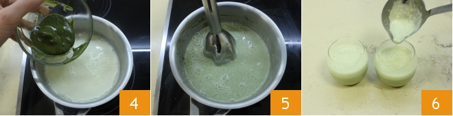 and add the condensed milk. Stir again and finally add the pistachio paste 4 and a pinch of salt. As an alternative to pistachio paste, you can achieve a similar result by finely blending the same amount of unsalted shelled pistachios with a splash of milk. Blend the mixture with an immersion blender for a few seconds 5, then divide the obtained cream into the glasses 6